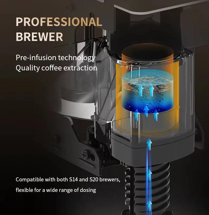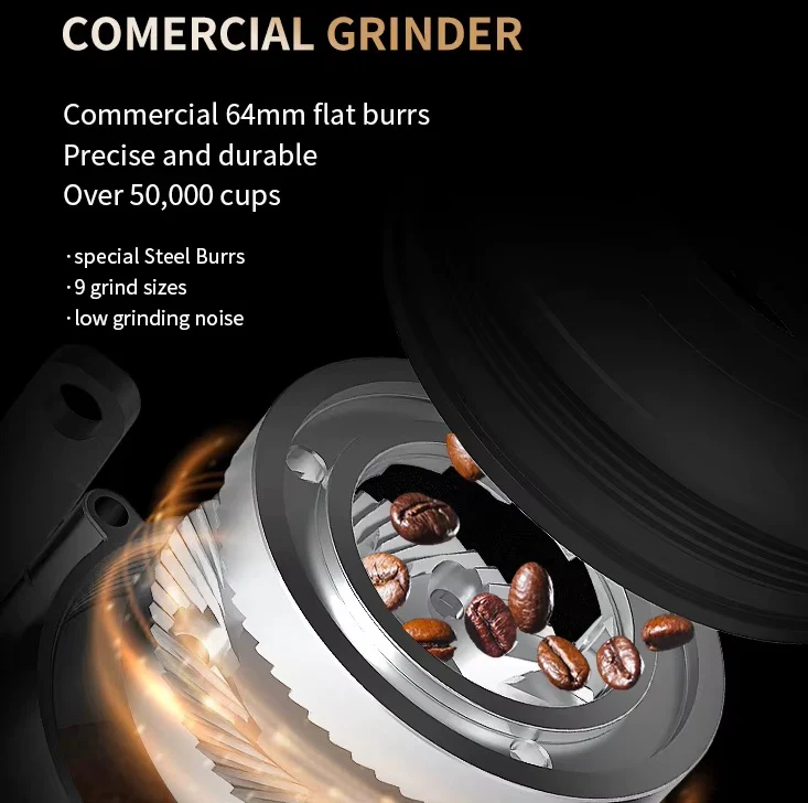 - Professional Grinder: The machine features special steel flat burrs, ensuring powerful and durable grinding. This precise adjustment delivers uniformly ground particles, contributing to high-quality coffee extraction.